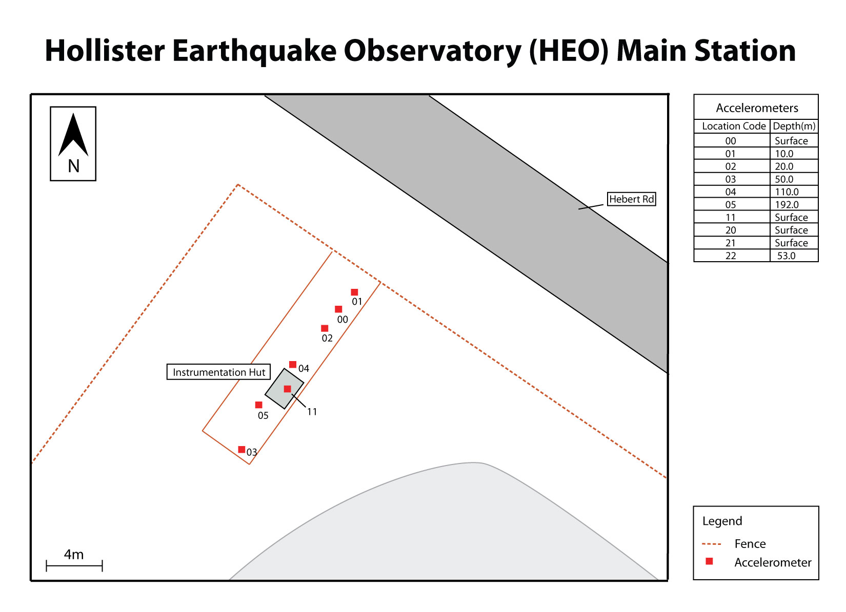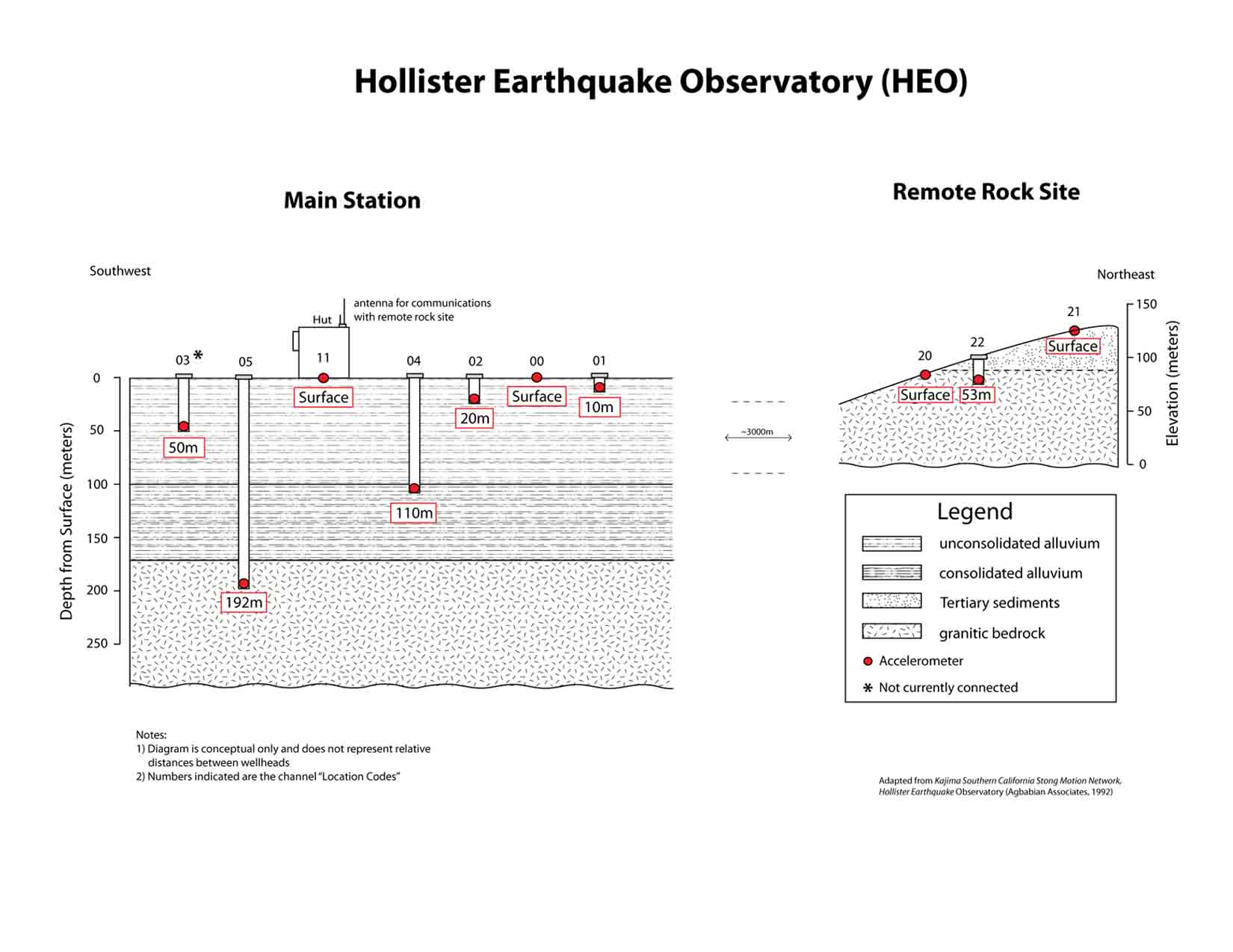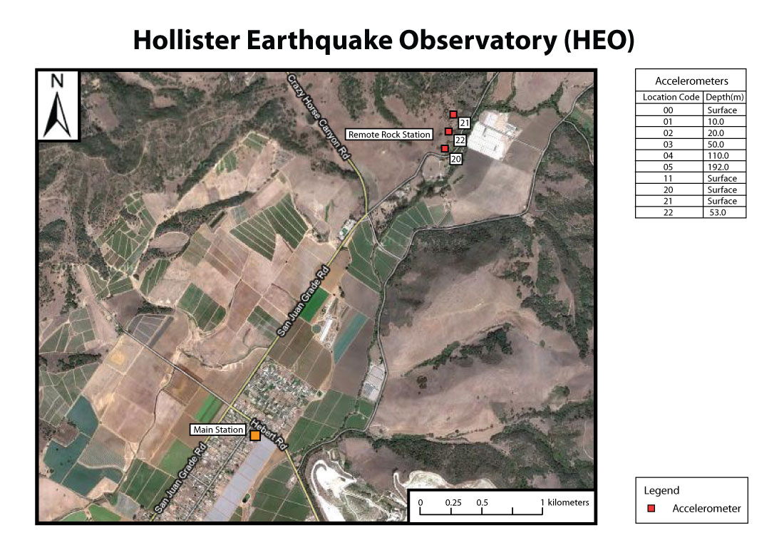 Agbabian Associates installed the Hollister Earthquake Observatory (HEO) in 1991 with funding from the Kajima Engineering and Construction Corp. Kajima Corp donated this array to the University of California, Santa Barbara in January 1998. The site is located in the Salinas Valley about 10 kilometers from the San Andreas fault near the cities of Hollister and Salinas in central California. The ground motion array consists of a vertical array of six accelerometers in Quaternary alluvium and bedrock, and three accelerometers installed at a remote rock station, 3 km to the Northeast. The location of HEO along the San Andreas Fault in Central/Northern California increases our chances of recording a moderate to large earthquake.